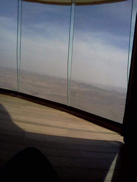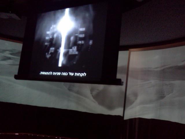זה אמור להיות המיצג המרכזי של הביקור כאן וככזה הוא לגמרי מפוספס. ההקרנה על המסך האחורי הגדול עקומה וגלית ומתנועעת על הוילון הלא ישר ולא מתקשרת בשום צורה להקרנה על המסך הקדמי (הקטן מידי, כבר אמרנו?). עזרי שביקר איתי במקום פינטז על הקרנה על גבי משטחים שמחפים את החלון כתריס ושבסיומה של ההקרנה מסתובבים על צירם, וחושפים את נוף המכתש הקסום מאחור. אחלה רעיון.