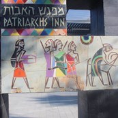 הפסל בנוי קוביית בטון, ועליה מוצמדים אריחי קרמיקה המציגים תמונות מדבריות – תנכ"יות נאיביות בסגנון כנעני, שהיה כל כך פופולרי בשנות החמישים והשישים של המאה הקודמת ועושה קאמבק מפואר בקרב אספנים כיום. על הפסל כתובת: "מפגש האבות" ובאנגלית " The Patriarchs inn".