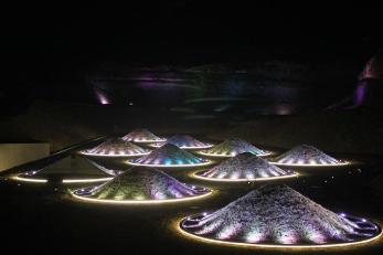 בלילות הקיץ, המקום מואר בתאורה לדית צבעונית מתחלפת והתילים משנים את צבעם מידי דקה ודגם הר הגעש פולט אש ועשן. סוג של אטרקציה לילית לשוכני הצימרים בקיץ. לאור העובדה שהגולן שומם מפעילות תיירותית בשעות הלילה, יכול להיות שמדובר באטרקציה מושכת קהל, היא לא מאוד לטעמי. הנה תמונה לילית שמצאתי באתר "מפה":