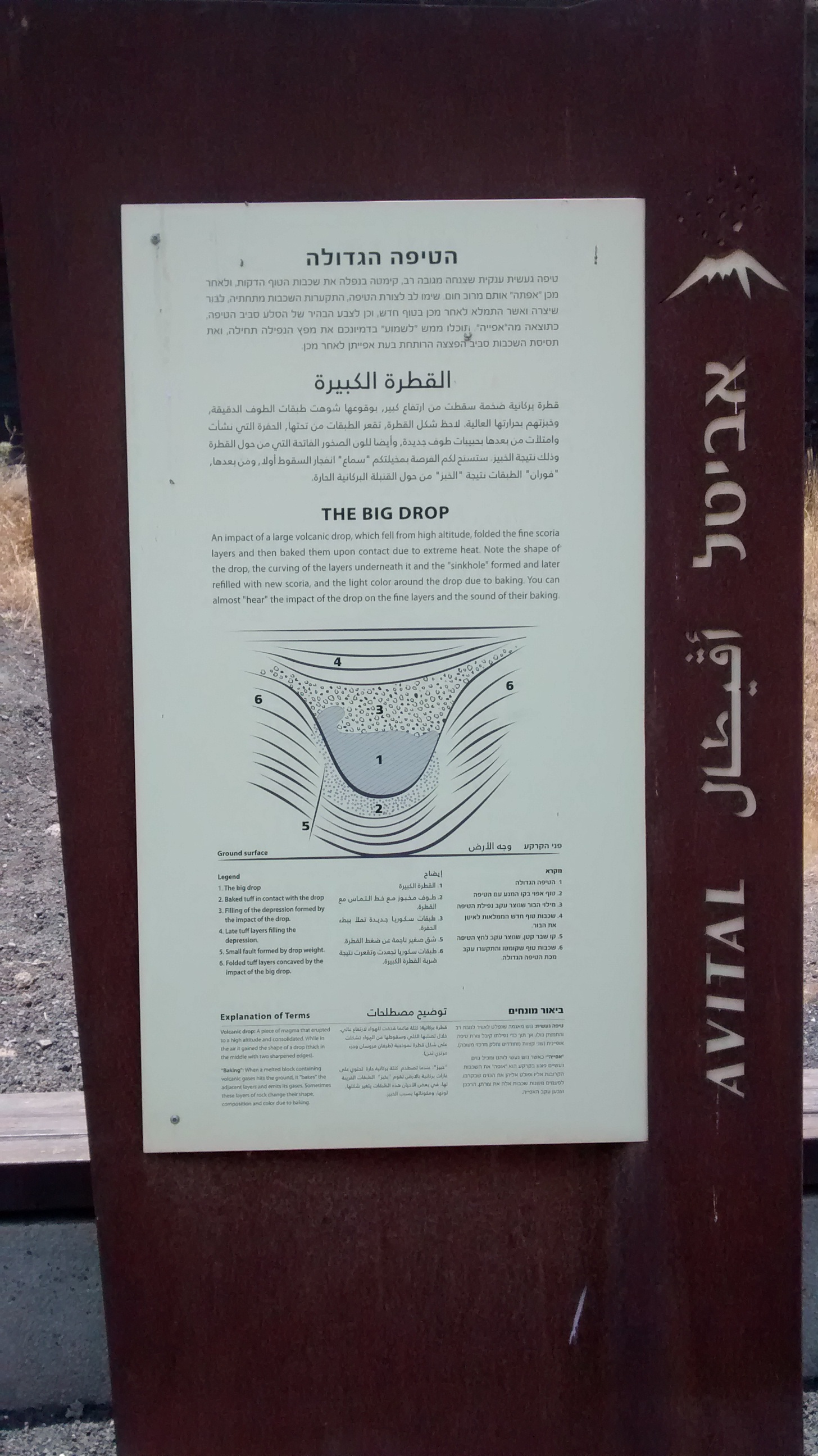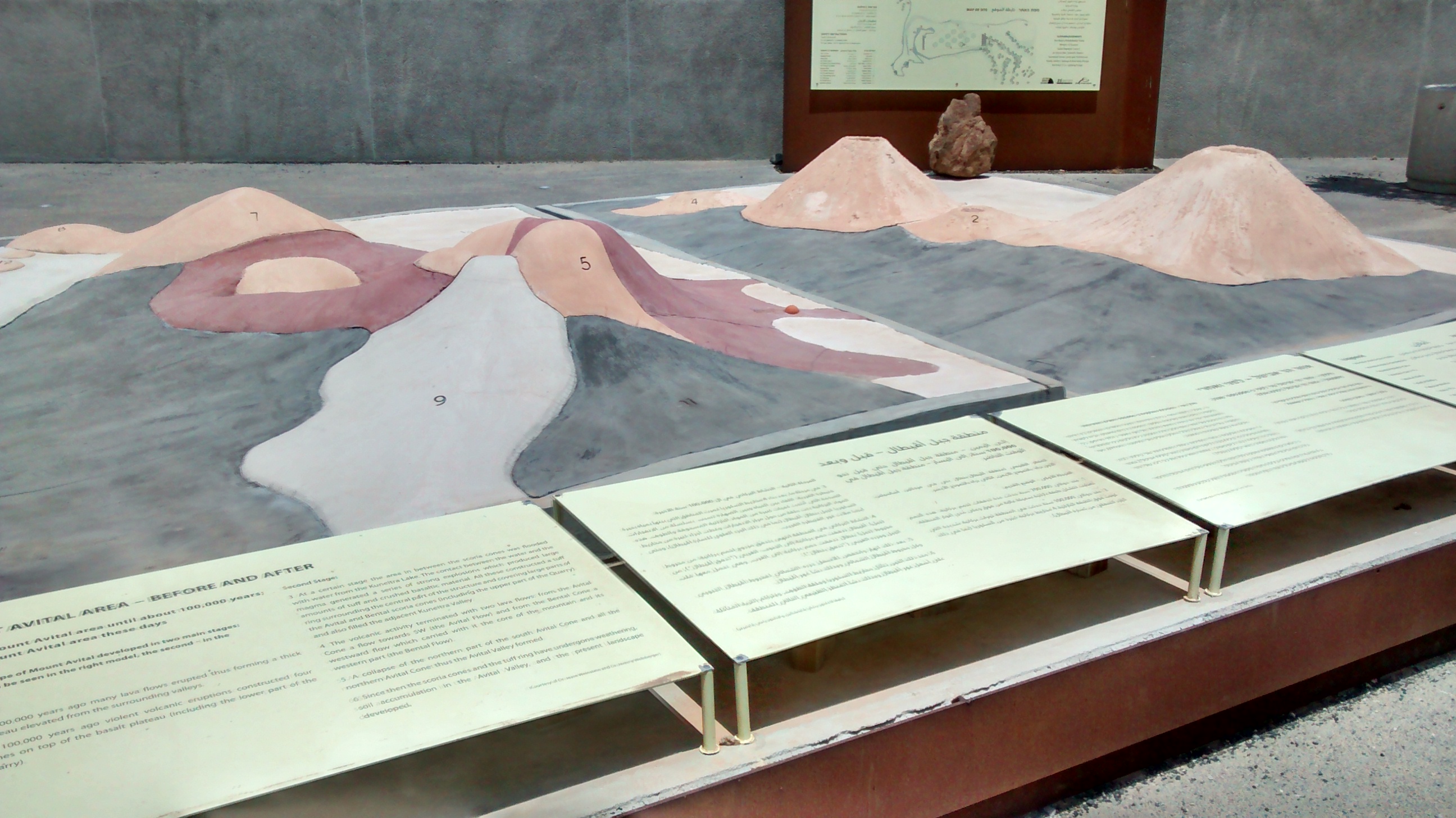 בכניסה לאתר – דגם גיאולוגי גדול ומוצלח, המדגים את הר אביטל לפני ההתפרצות הגעשית ואחריה: