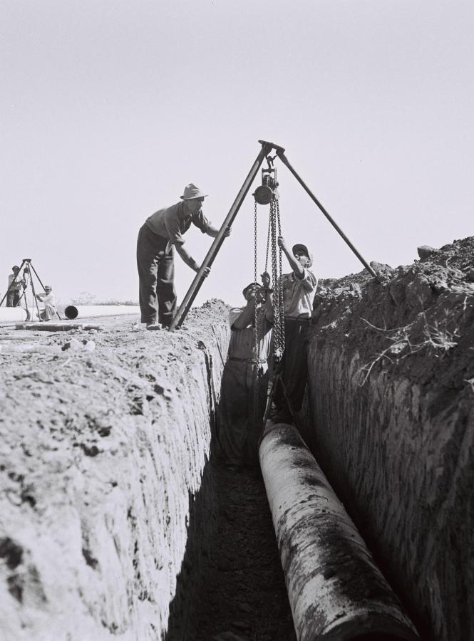 "MEKOROT" WORKERS LAYING A WATER PIPIELINE NEAR KIBBUTZ NIR AM.