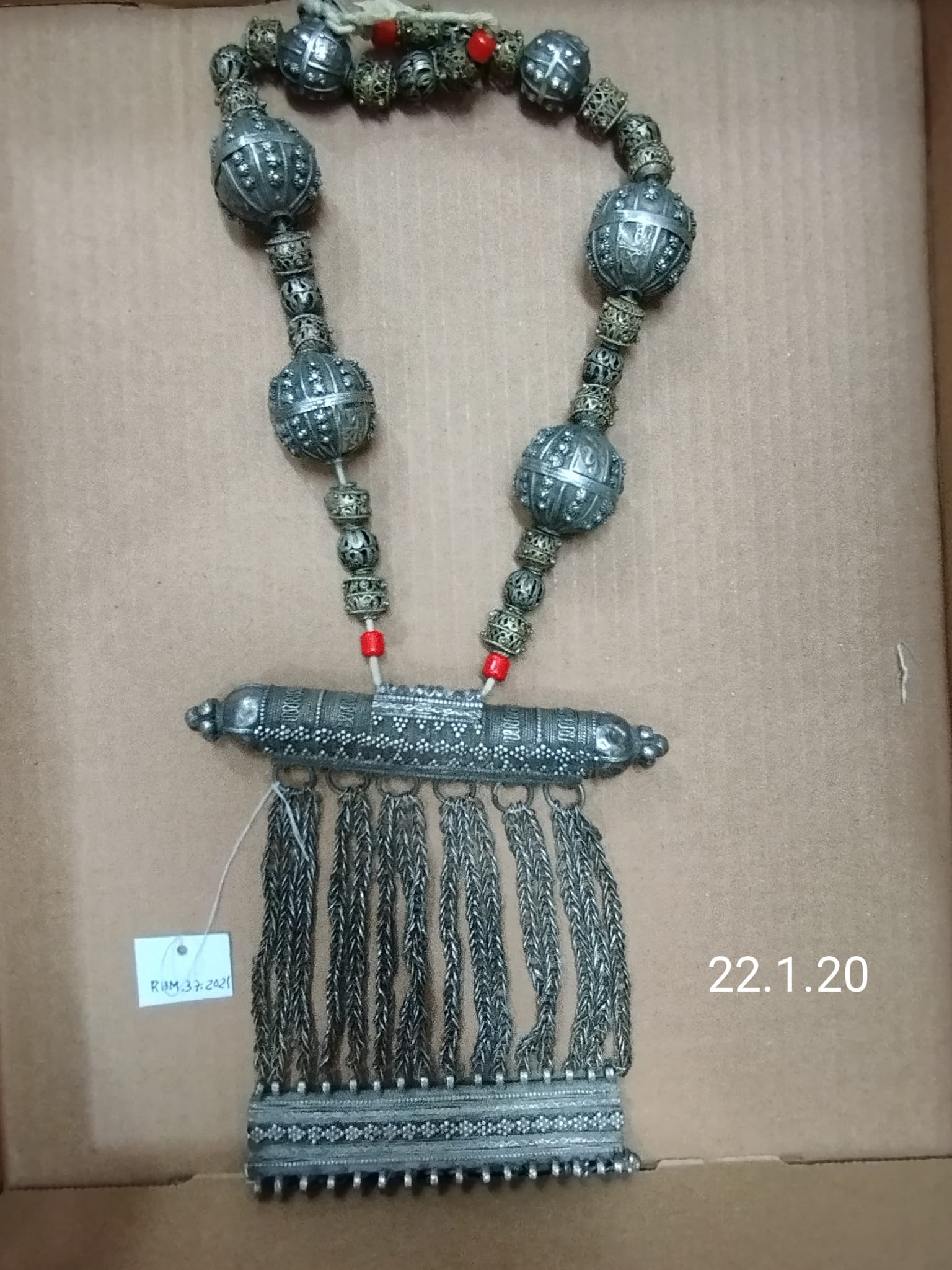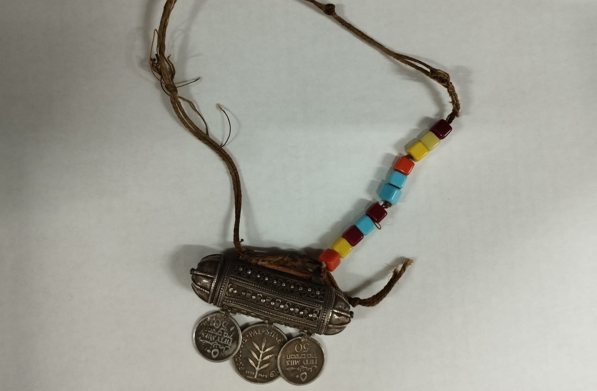 בית הקמע מחובר בחוט כותנה ישן מאוד למחרוזת, אליה מושחלים חרוזי פלסטיק צבעוניים ופשוטים. הפער הזה בין חרוזי הילדים הפשוטים והזולים לבית הקמע הישן והמוקפד, והמטבעות מתקופה אחרת וארץ אחרת – הוא סוד הקסם של התכשיט הזה, הוא זה שמייצר את הסקרנות והעניין, יותר מתכשיט מפואר ושלם, בעיני לפחות.