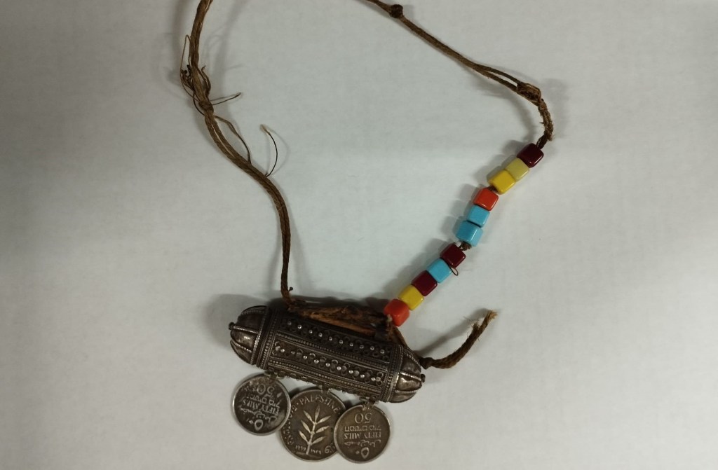 אני אוהבת את התכשיט הזה. מצאתי אותו על בשקית ללא שם תורמת באוסף ההיסטורי של מרכז מורשת יהדות תימן בראש העין, שהופך צורה בימים אלה לקראת חנוכתו כבית המייסדים של ראש העין, אותו אני אוצרת.